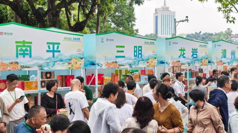 来自全省各地的绿色食品企业参加展销对接,产品涵盖果、菜、茶等初级产品及加工品,吸引众多客商前来交流。 傅心婕 摄
