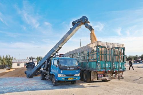 图为建设农场第五管理区刚收获的玉米正在快速完成装车销售。 资料图