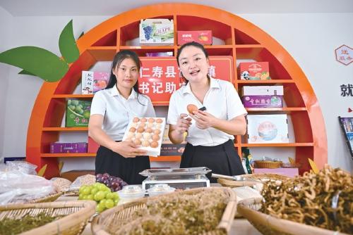 富家镇大山村党总支书记杨奕(右)正在直播销售大山村的农产品。 郭侨 摄