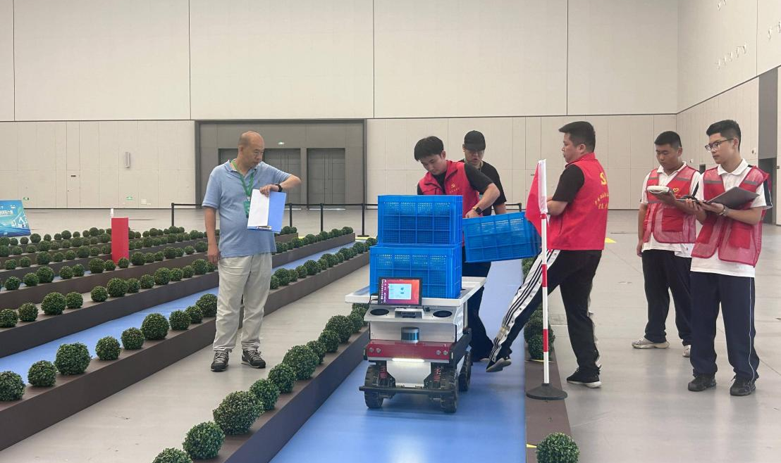 10个红色障碍物、3处转弯、4个装载任务点位……走进温室搬运机器人赛场,只见在模拟温室环境的赛道上设置有重重挑战。随着裁判一声令下,来自杭州神农氏机器人有限公司的机器人缓缓启动,在3D激光、深度视觉等技术加持下遇到障碍物时自动调整绕行,稳稳行驶至任务点完成农资装载后继续前行。