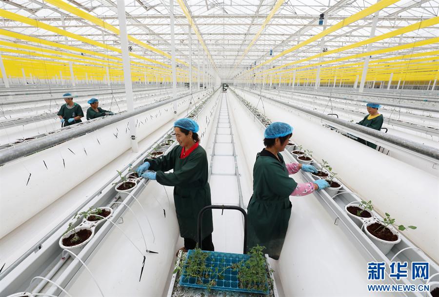 近日,安徽省淮北市烈山区古饶智慧农业产业园智能化玻璃大棚内,工人正在种植番茄。
