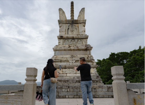 塔斗山巅,一座古塔临风望海,见证着海上丝绸之路的千年沧桑。天中万寿塔周身布满精美浮雕,充满着浓郁的异域风情,是福建地区目前发现的最大宝箧印塔。海峡网主播带着直播间的粉丝看向了塔上的浮雕,“大家看这些浮雕,非常的丰富精致,融合了佛教艺术与本土文化,也代表着自古以来海上丝绸之路的文化交流。”