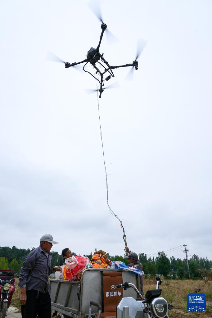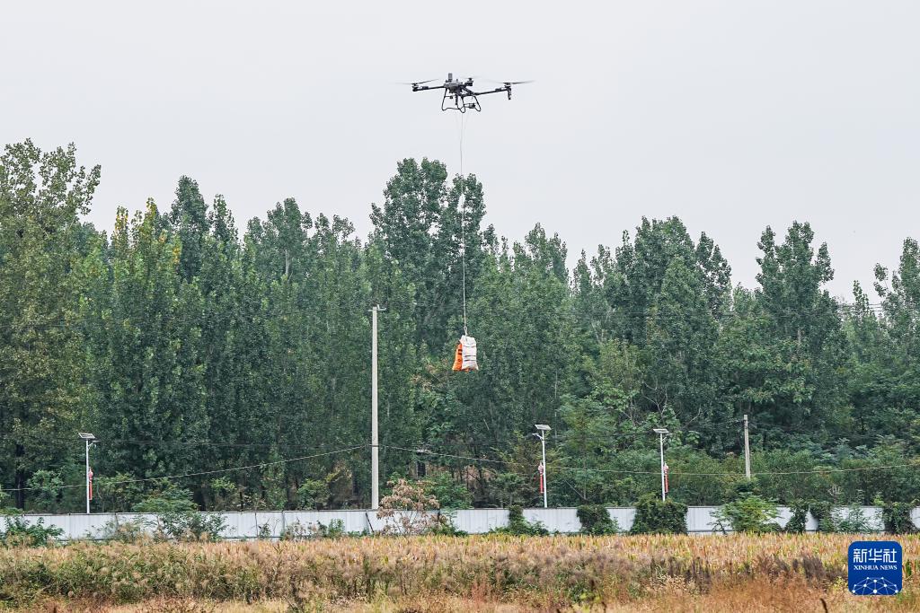 10月11日,沂南县张庄镇种植户用无人机吊运收获的玉米。