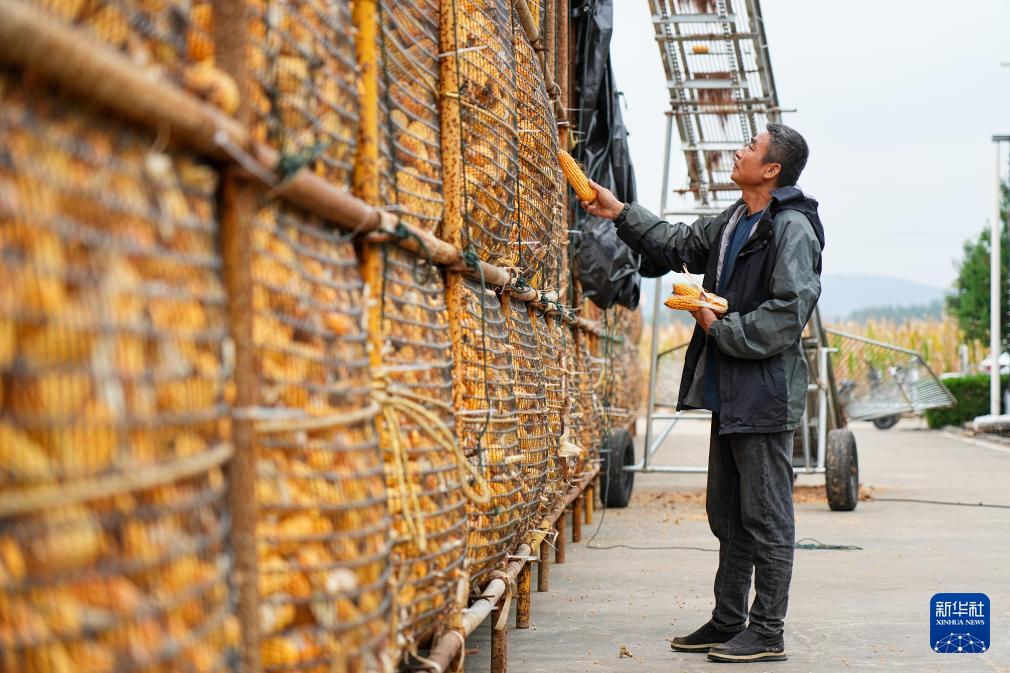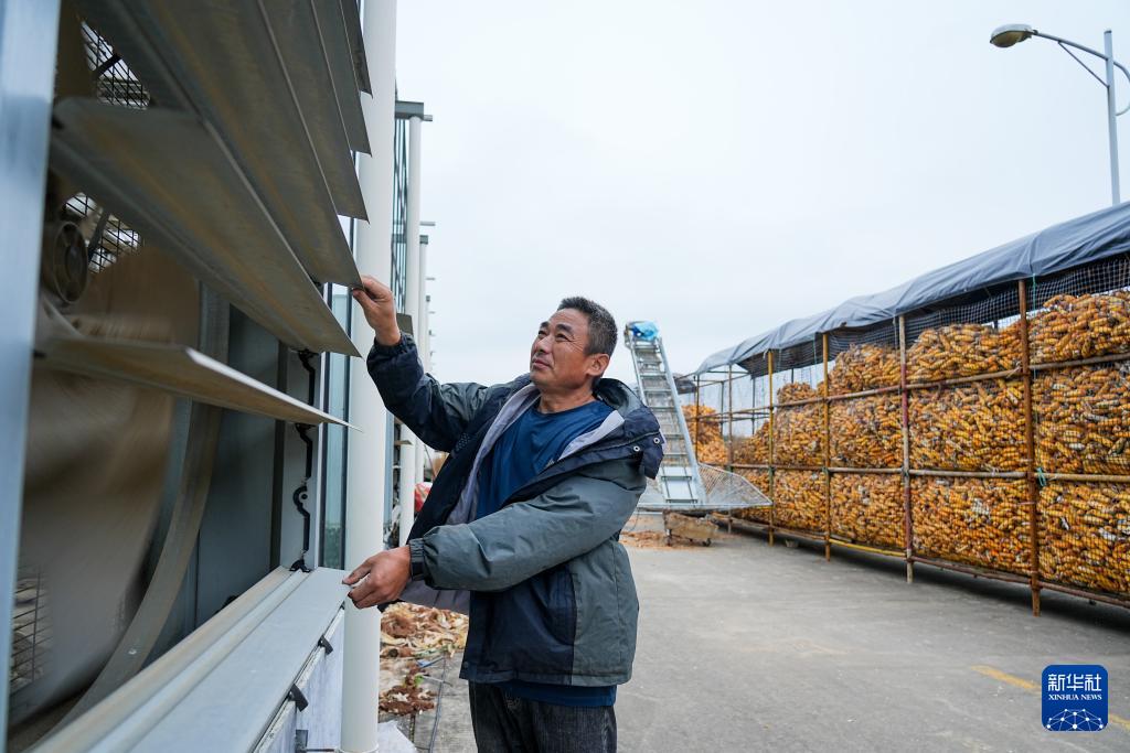 10月11日,沂南县张庄镇种粮大户刘增升利用大棚排风扇干燥收获的玉米。