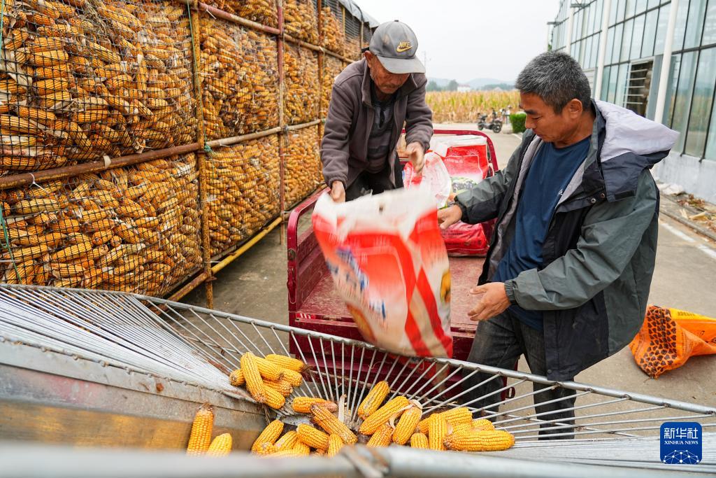10月11日,沂南县张庄镇种粮大户刘增升(右)储存收获的玉米。
