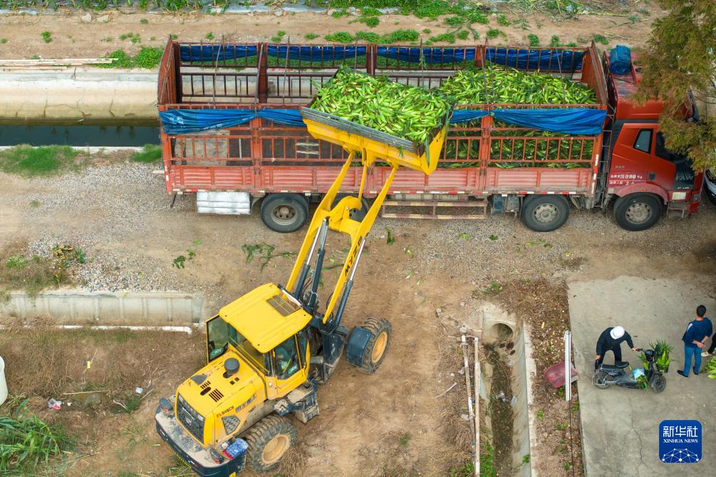 10月14日,在南县华阁镇新安村,村民操作铲车把刚采摘的水果玉米运输上车(无人机照片)。