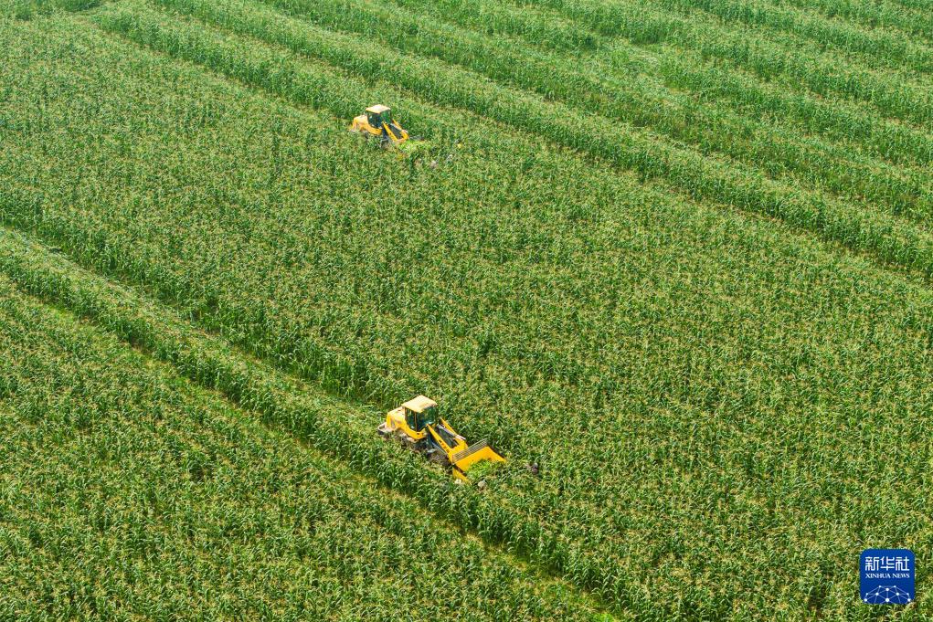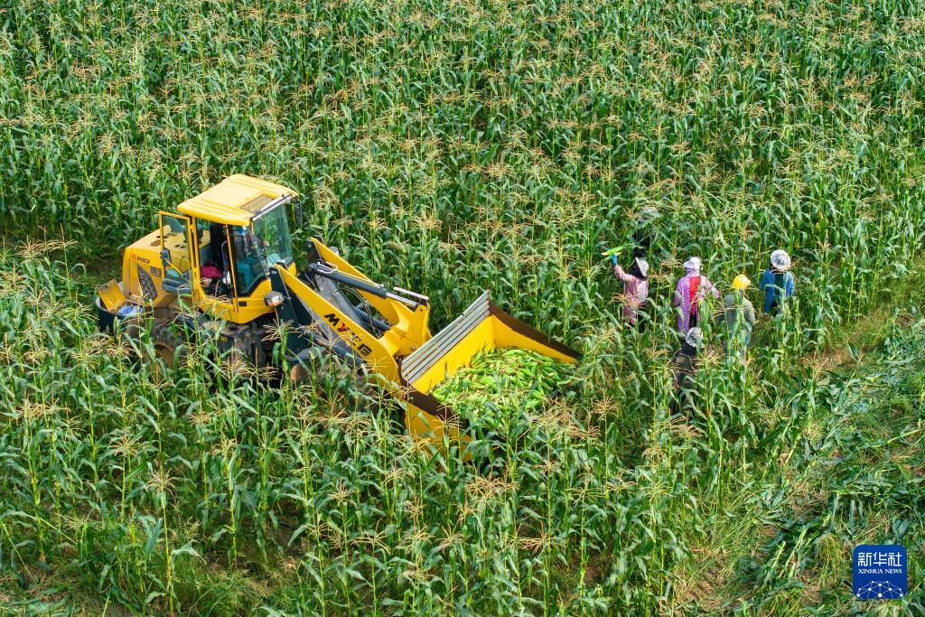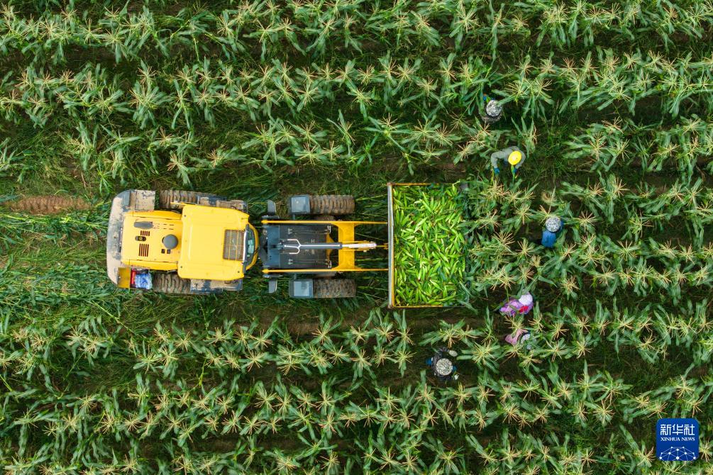 10月14日,在南县华阁镇新安村,村民在采摘水果玉米(无人机照片)。