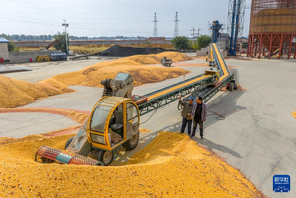 10月15日,在内蒙古巴彦淖尔市乌拉特前旗,工作人员遥控操作农机将玉米送入烘干塔(无人机照片)。