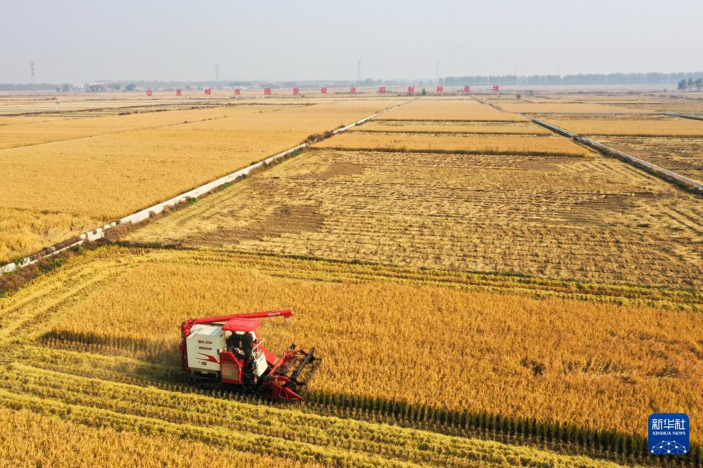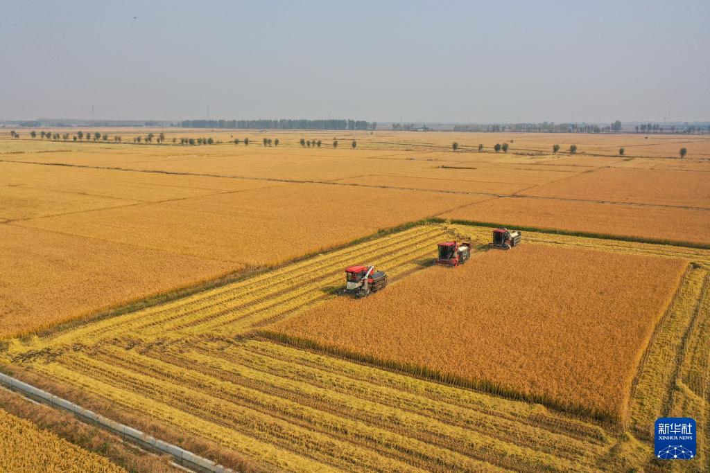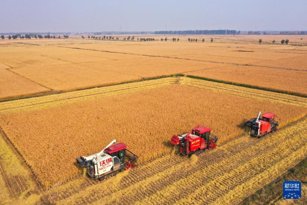 10月14日,在吉林省公主岭市,吉林省米兜种植农民专业合作社进行机械化收割水稻作业展示(无人机照片)。