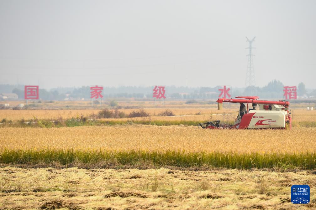 10月14日,在吉林省公主岭市,农民驾驶农机收割水稻。