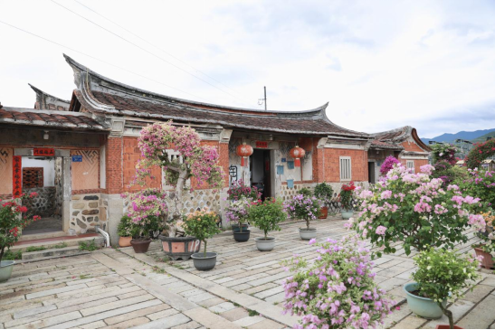 在大力发展三角梅产业的同时,古坑村也积极盘活闽南匣钵古厝群,沿着西源溪一路走,主播们来到了红砖黛瓦的传统古厝,古厝山墙多使用碎窑坯铺砌而成,层次分明、别具一格,是发展闽南特色民宿的重要基础。