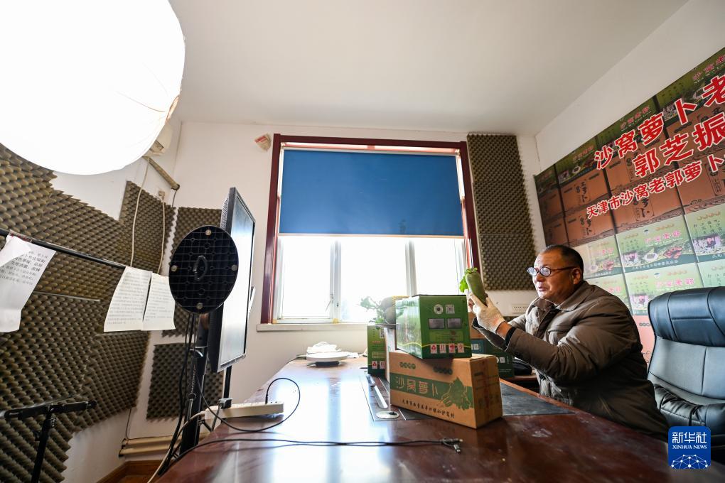 11月20日,在天津市西青区辛口镇一家萝卜专业合作社,农户在直播推广沙窝萝卜。