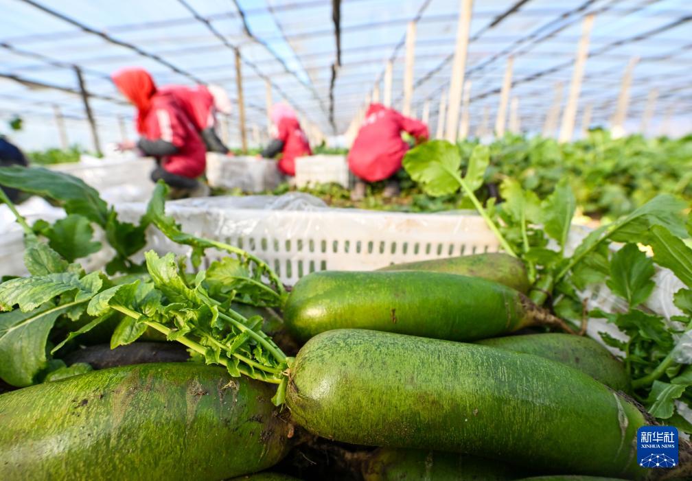 11月20日,在天津市西青区辛口镇种植沙窝萝卜的大棚内,农民在采摘萝卜。