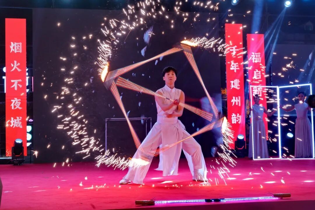 《春茶意暖》舞出温婉,《红红日子》唱出欢腾,《时空魔方火焰舞》引爆全场,摇滚歌手与观众热情互动……舞台上下,融为一体。鼓声、歌声、笑声,交织成建州不夜城最动人的夜景。