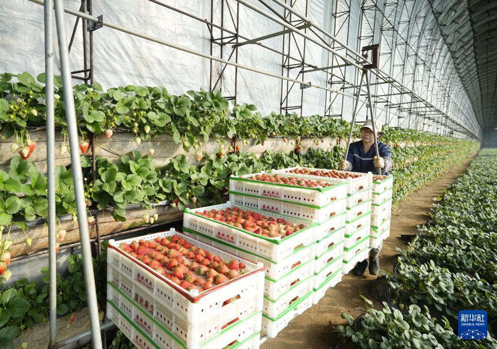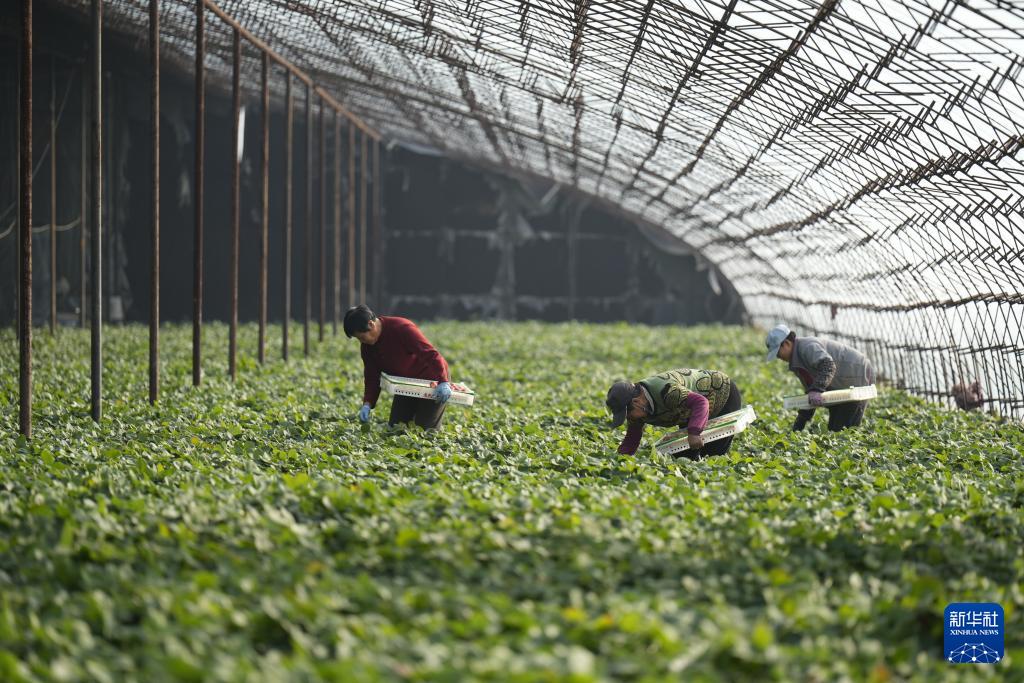 1月15日,农民在河北省滦州市一家现代农业产业园大棚内采摘草莓。