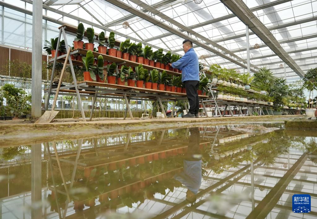 1月15日,河北省滦州市一家花卉生产基地的员工在温室内整理绿植。