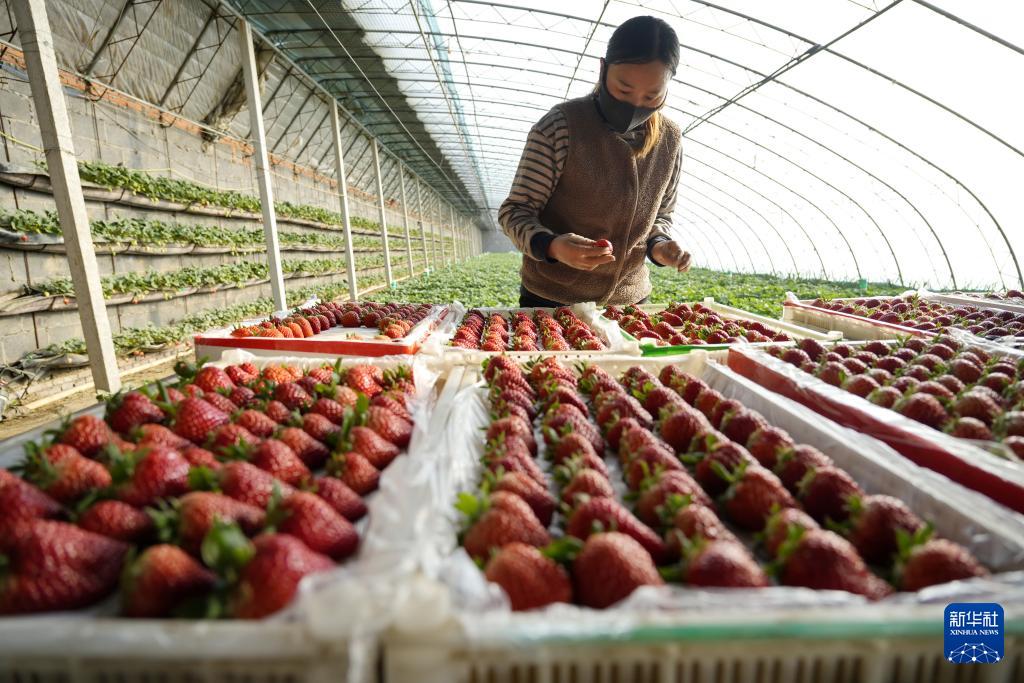1月15日,农民在河北省滦州市一家现代农业产业园大棚内整理采摘的草莓。