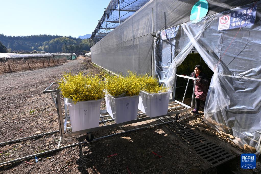 1月14日,位于福建省周宁县浦源镇的田园农业开发有限公司,企业负责人在整理冬青盆栽。