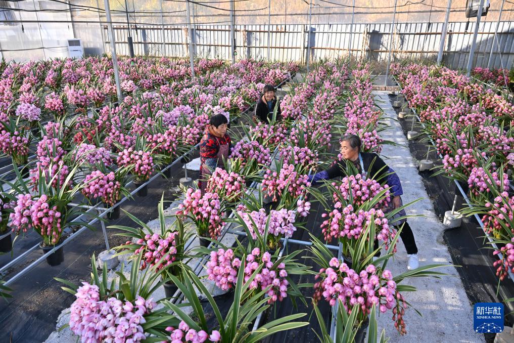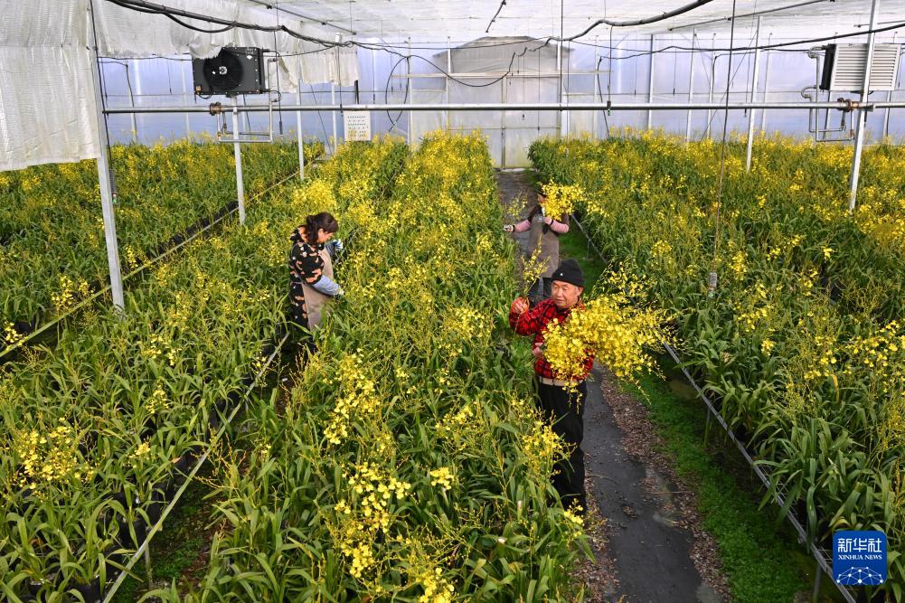 1月14日,位于福建省周宁县浦源镇的紫馨兰园花卉有限公司花卉大棚内,工人挑选大花惠兰盆栽。
