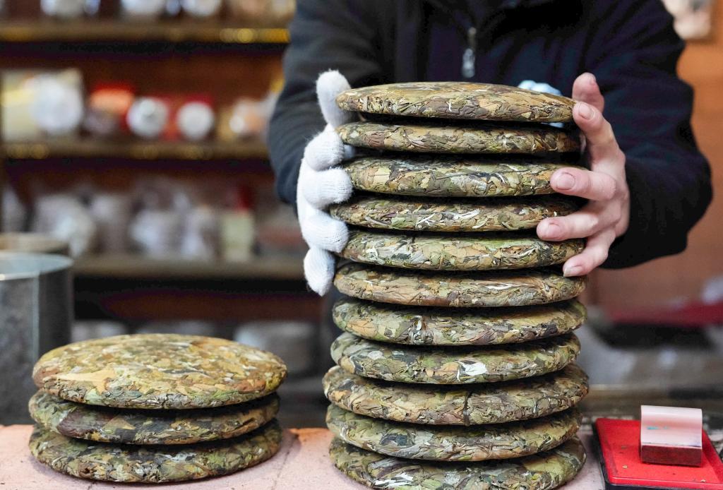 这是1月14日在那柯里村拍摄的普洱茶饼。新华社记者 陈欣波 摄