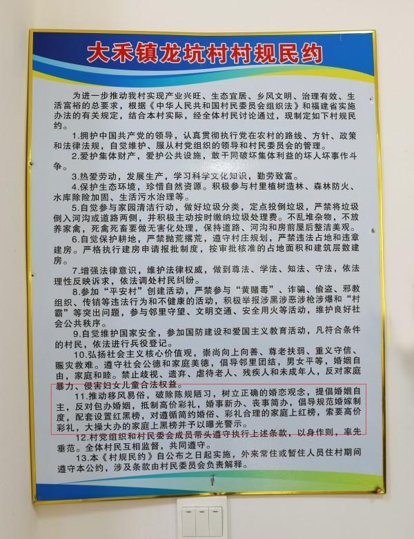抵制高价彩礼被写入大禾镇龙坑村村规民约(红框处)。记者 傅心婕 摄