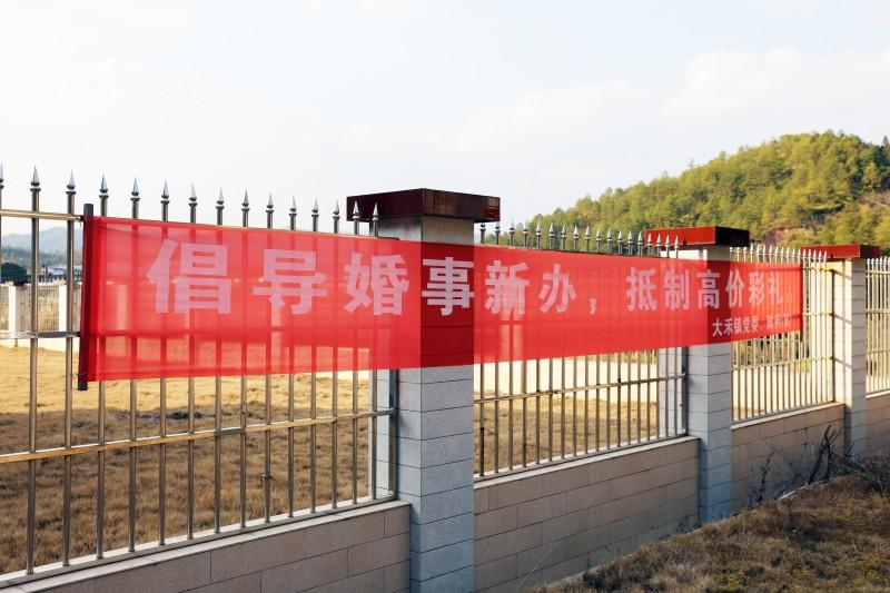 大禾镇内处处可见推动婚俗新风尚的标语。记者 傅心婕 摄
