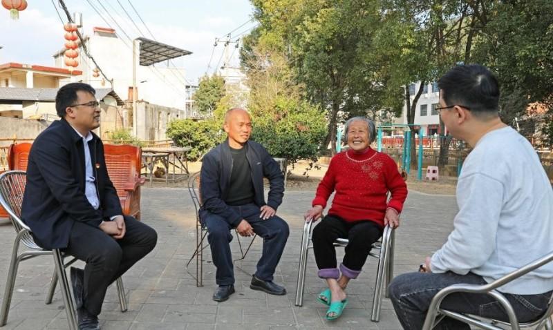 大禾镇分管领导陈仁锋、龙坑村书记刘荣钦与“宝藏阿婆”蓝香秀接受记者采访。记者 傅心婕 摄