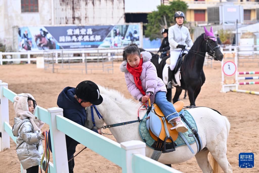 2月7日,在霞浦县宏昌工业文创基地跑马场,一名小女孩学习骑马。