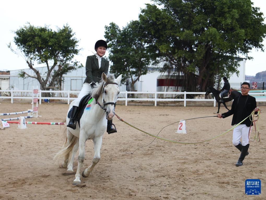 2月7日,在霞浦县宏昌工业文创基地跑马场,学员(左)在工作人员的协助下学习骑马。