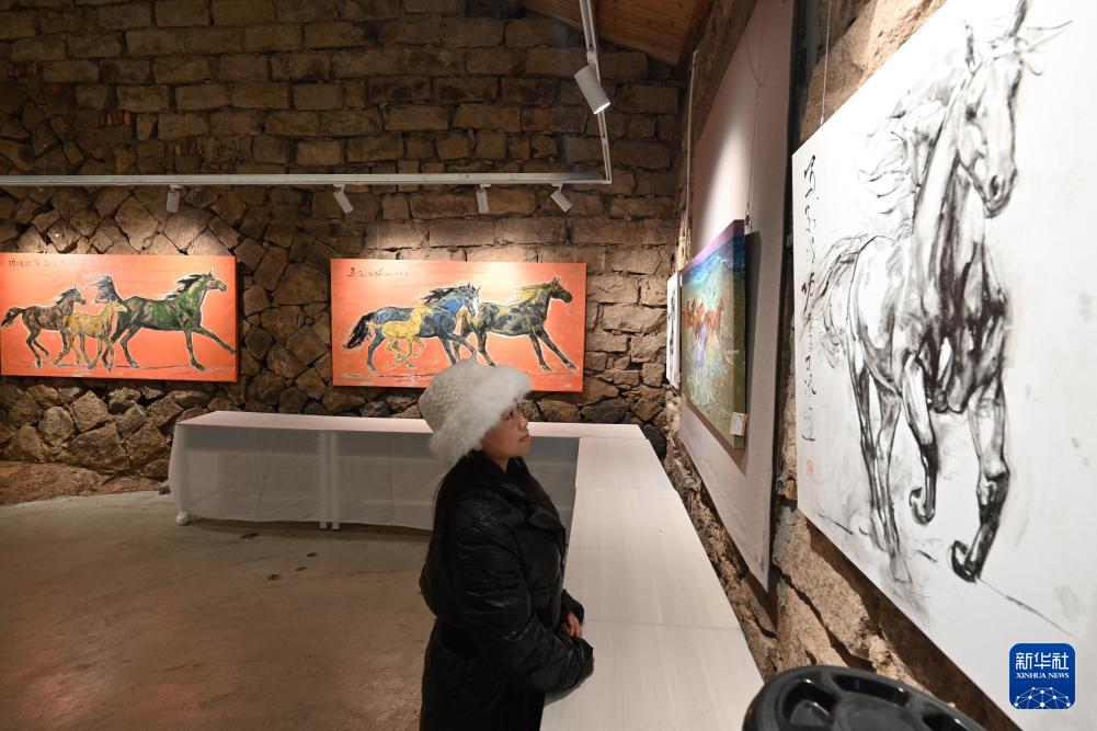 2月7日,游客在霞浦县宏昌工业文创基地观看马文化美术展。