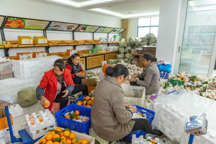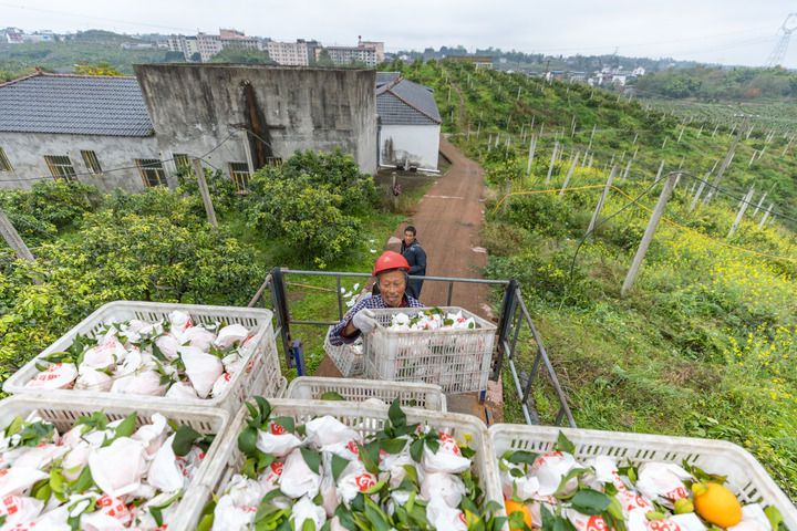 在重庆市忠县新立镇桂花村,村民将采摘回来的爱媛橙打包装箱。