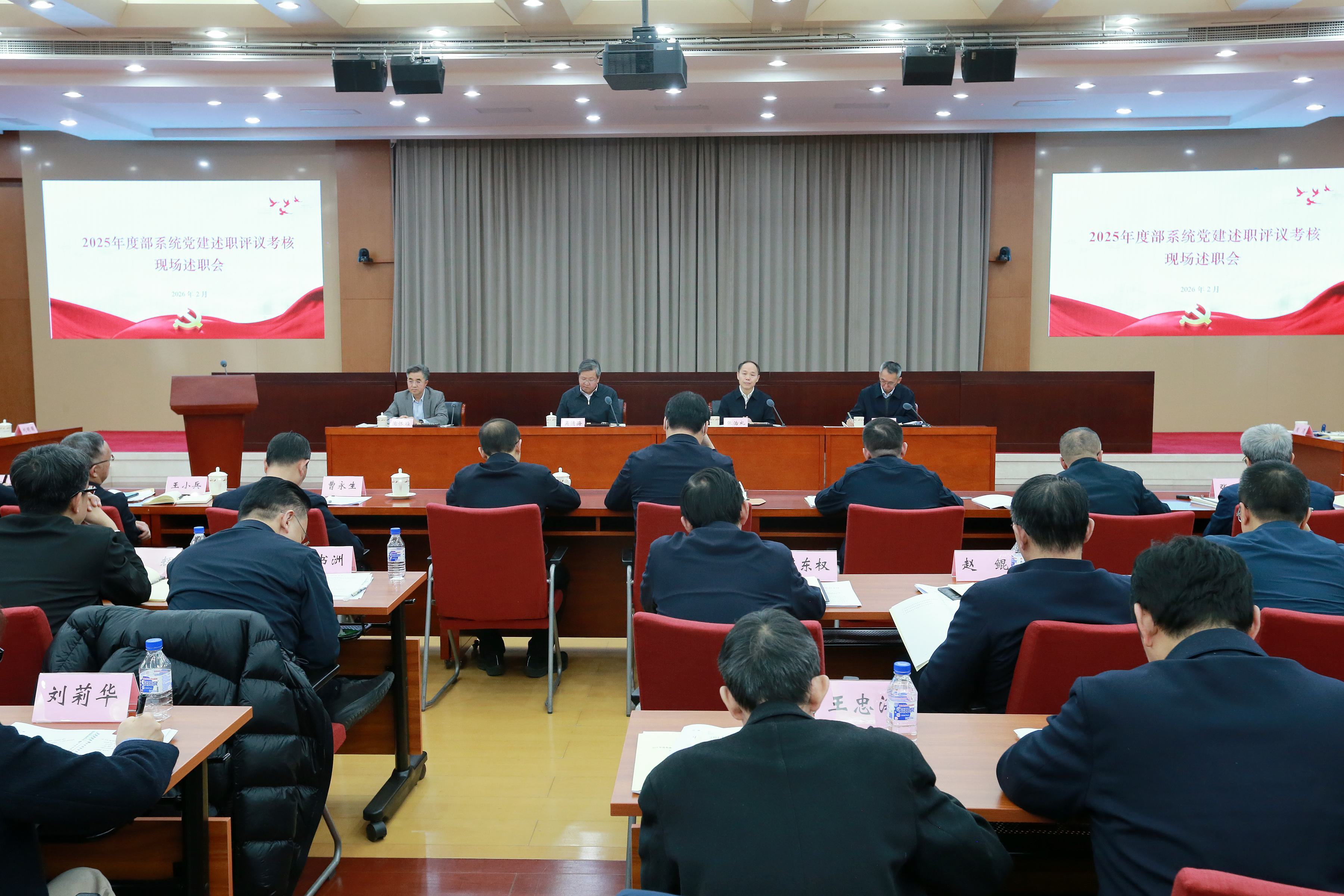 12名直属党组织书记、4名纪委书记进行了现场述职。部党建工作领导小组成员单位负责同志及部系统各司局单位党组织书记、纪委书记共110余人参会。