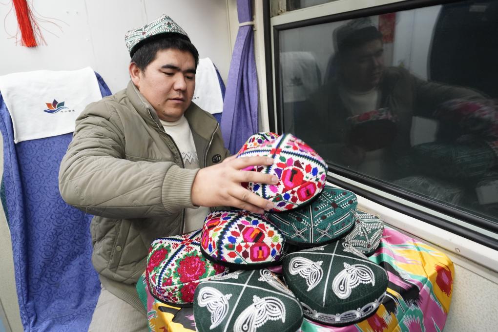 他的邻座,喀什市商户艾麦提·阿卜杜热依木将一顶顶花帽在小桌上细心排开。石榴花、巴旦木纹在艳丽的底色上绽放,针脚细密如绣。“很多在南疆工作生活的朋友,过年要回老家,”艾麦提一边整理一边说,“挑选一顶花帽回家,是份地道的新疆心意。”