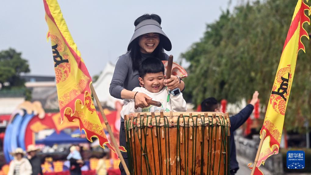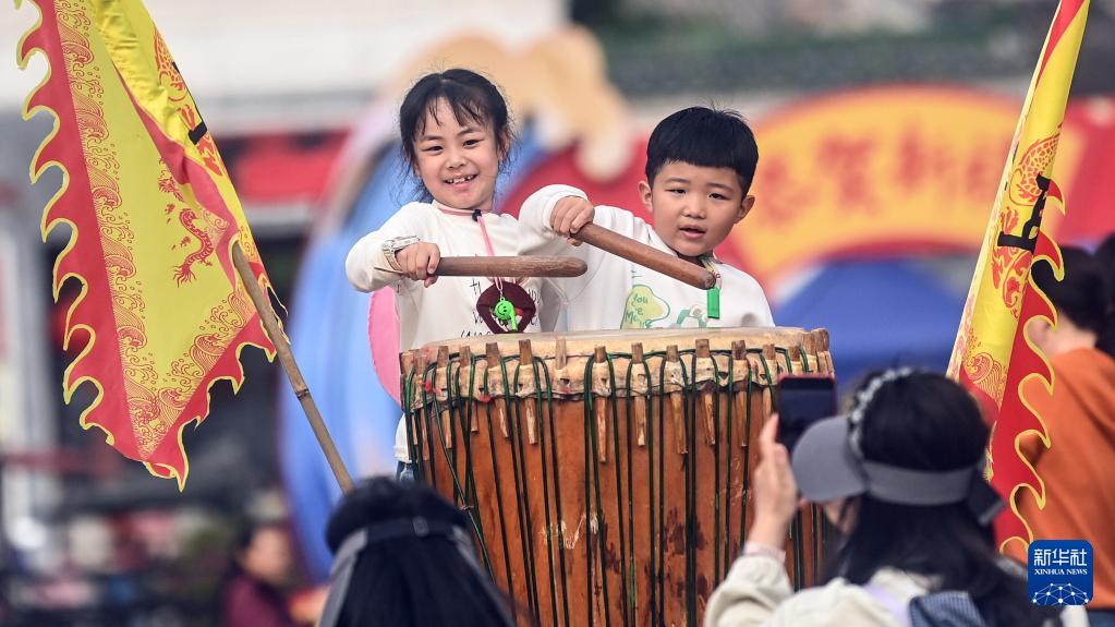 2月22日,在广西钦州市刘永福广场,两名少儿在体验击鼓乐趣。