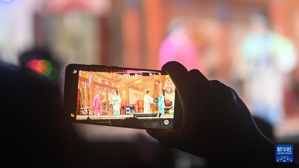 2月22日,在广西钦州市刘永福广场,一位市民在拍摄采茶戏。