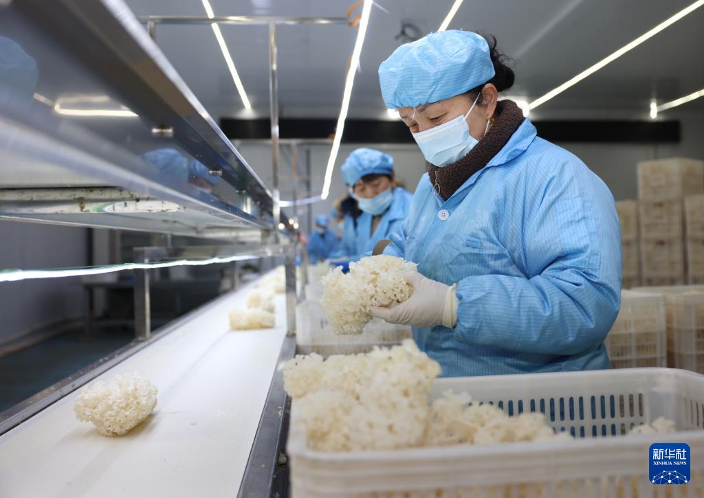 2月27日,河北省新河县众乐种植专业合作社工人在加工车间分拣绣球菌。