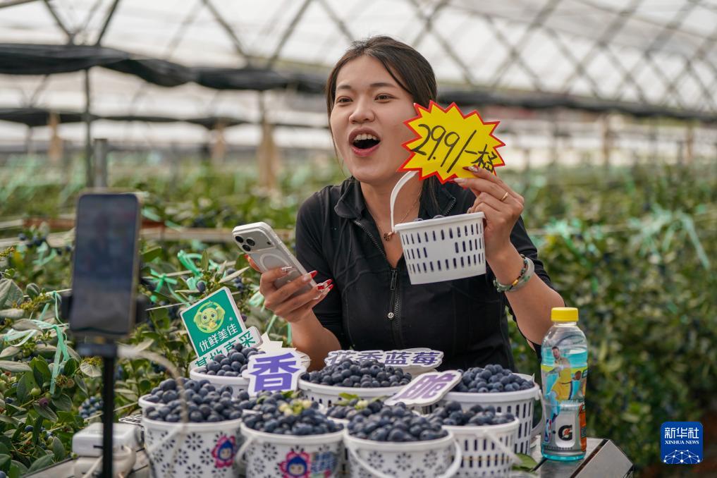 2月27日,工作人员在蒙自市一处蓝莓生产基地直播销售蓝莓。