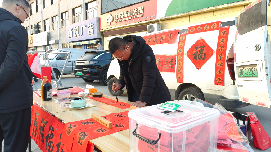 喧嚣之中,一处手写春联的摊位显得有些安静。摊主张大哥铺开红纸,提笔蘸墨,一副行云流水的对联一气呵成。“对联加福字,一套15块。”他说,自己在单位上班,放假了就过来写写字,“印刷品满大街都是,但我寻思,总有人想找副手写的对联,挂在家里有墨香味儿。”一上午卖了十几副,不算多,但他并不着急,手机支架立在案头,镜头正对着挥毫的双手。“刚开了直播,想让更多人看看手写的春联,让喜欢书法的人能找到地方。”