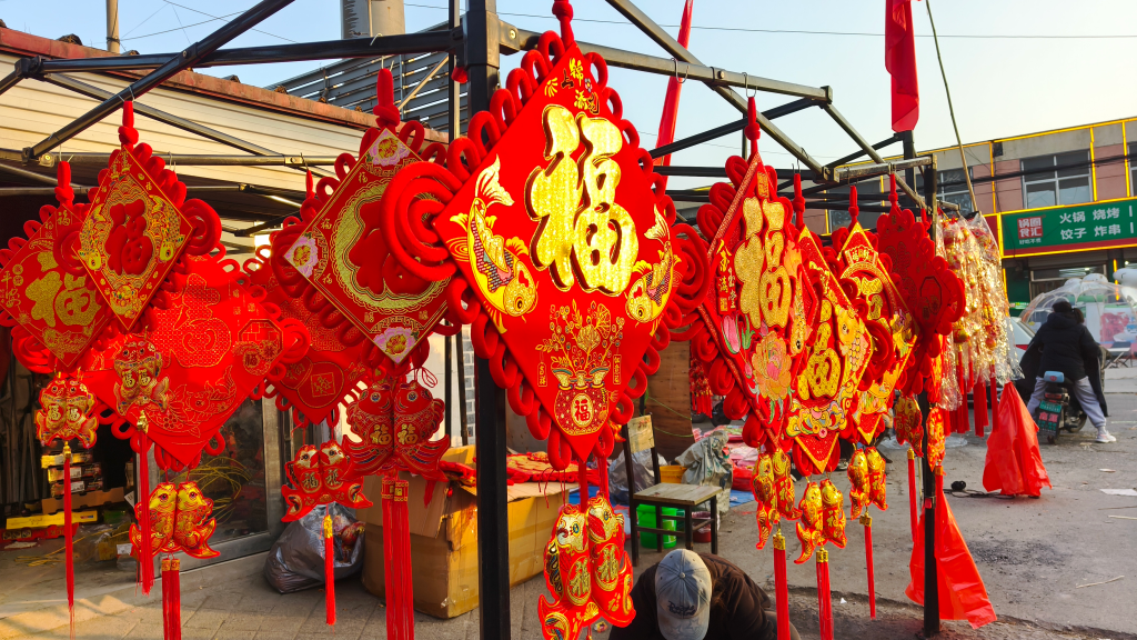 在人流密集的十字街口,卖节庆用品的刘大姐忙得抬不起头。红彤彤的春联、烫金的福字、造型各异的中国结挂满了整个摊位。“这半天下来,光微信收款就170多笔,卖了4000多块!”她一边给顾客找零,一边指了指刚刚拆开的纸箱,“这一箱中国结,不到仨小时抢光了。大的30,小的15,咱这质量实在,价格也实在。”