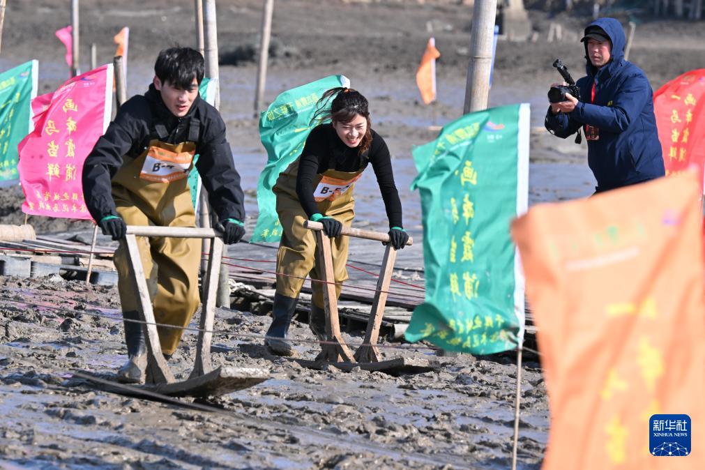 2月8日,选手们在霞浦县滩涂“木泥马”挑战赛上奋力向前滑行。