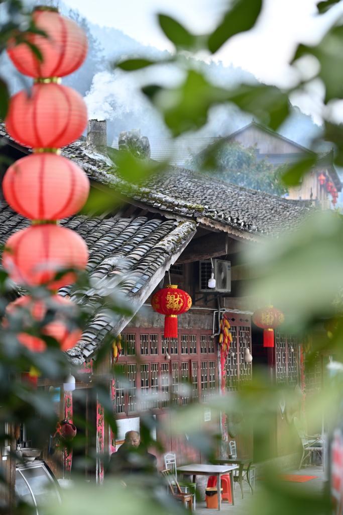 彭家寨吊脚楼挂上红灯笼。新华社发(陈绪开 摄)
