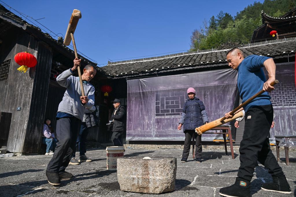 村民在打糍粑。新华社发(陈绪开 摄)