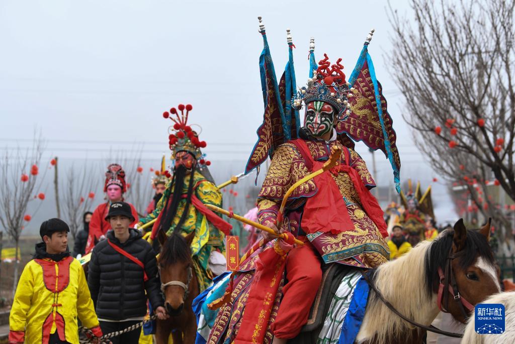 3月2日,陇县黄花峪村村民在家门口迎接社火队。