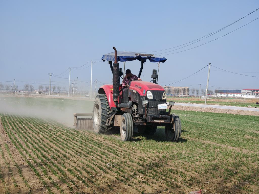 在河北省保定市望都县,农民驾驶镇压锄划机进行作业。新华社记者 王昆 摄