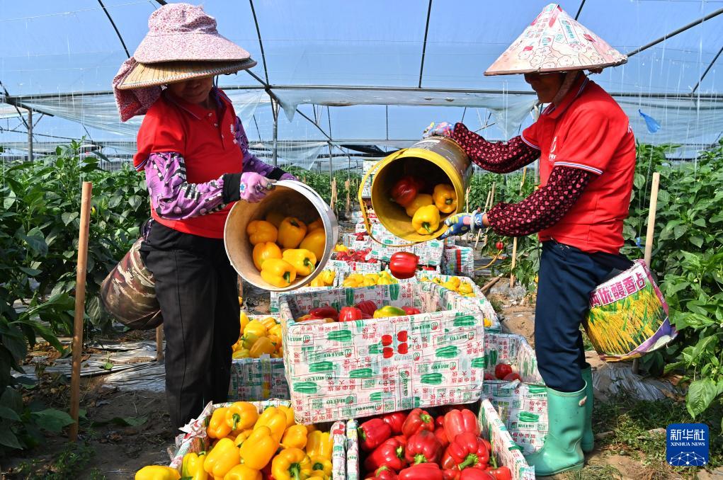 3月12日,工人在广西合浦县沙岗镇北海新佳恒农业技术服务有限公司设施蔬菜种植基地将刚采摘的彩椒倒进泡沫箱。