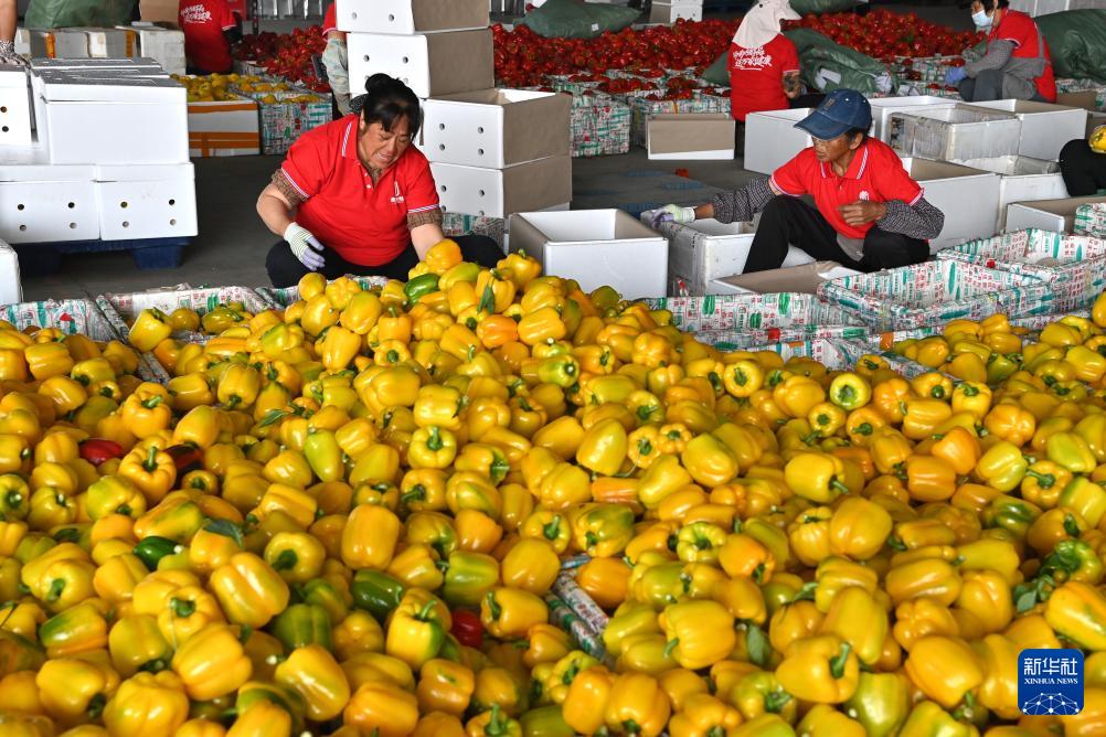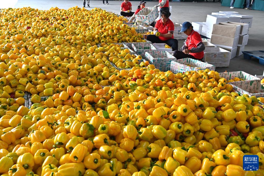 3月12日,工人在广西合浦县沙岗镇北海新佳恒农业技术服务有限公司设施蔬菜种植基地给彩椒装箱。