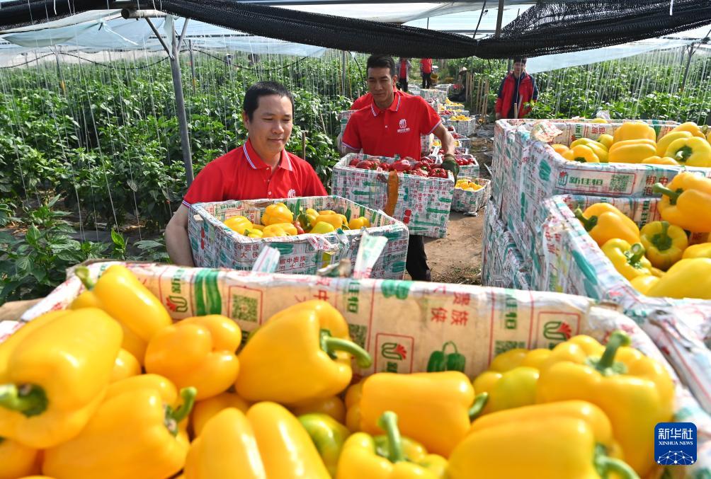 3月12日,工人在广西合浦县沙岗镇北海新佳恒农业技术服务有限公司设施蔬菜种植基地搬运刚采摘的彩椒。