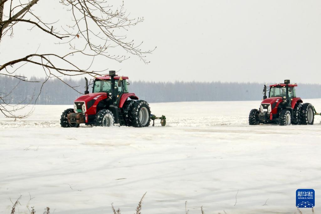 3月24日,北大荒集团北安分公司红星农场有限公司第二管理区有机小麦地块,大马力机车在进行耙雪散墒作业。