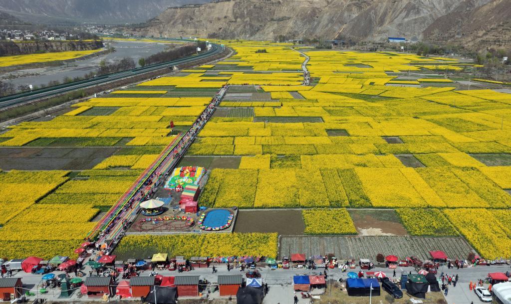 甘肃省陇南市武都区角弓镇硝坝子村油菜花基地里,游客在小型游乐园玩耍。新华社记者 李杰 摄