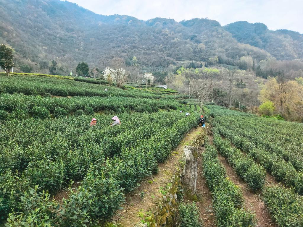 甘肃省陇南市文县碧口镇马家山村千亩茶园里,村民正在采茶。新华社记者 李杰 摄